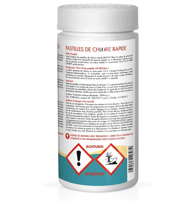Die sogenannten Chlor-schnell-Tabletten sind entwickelt zur schnellen Anhebung des Chlorgehalts in Ihrem Poolwasser. Somit sind sie sehr beliebt für eine Stoßchlorung oder Schock-Chlorung - werden aber auch zur dauerhaften Chlorung eingesetzt. Vor der Zugabe von schnell-löslichen 20gr. Chlortabletten, muss der pH-Wert mit einem geeigneten Testgerät (Messbesteck) überprüft und falls notwendig mit Zugabe von pH hebenden und oder senkenden Mitteln auf den Idealwert eingestellt werden. Idealer pH-Wert: 7,0 – 7,4