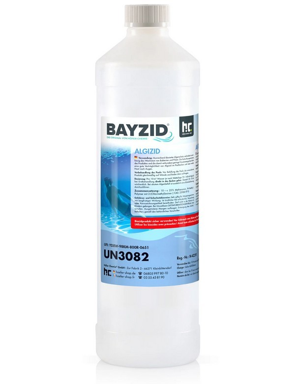 1-Liter- Algizid Algenverhütung von BAYZID ® ist ein Qualitätsprodukt und wurde in Europa hergestellt. Mit seinen chlorfreien und reizarmen Eigenschaften bietet er Ihnen bedenkenlosen Schutz. Außerdem ist er frei von Schaum.