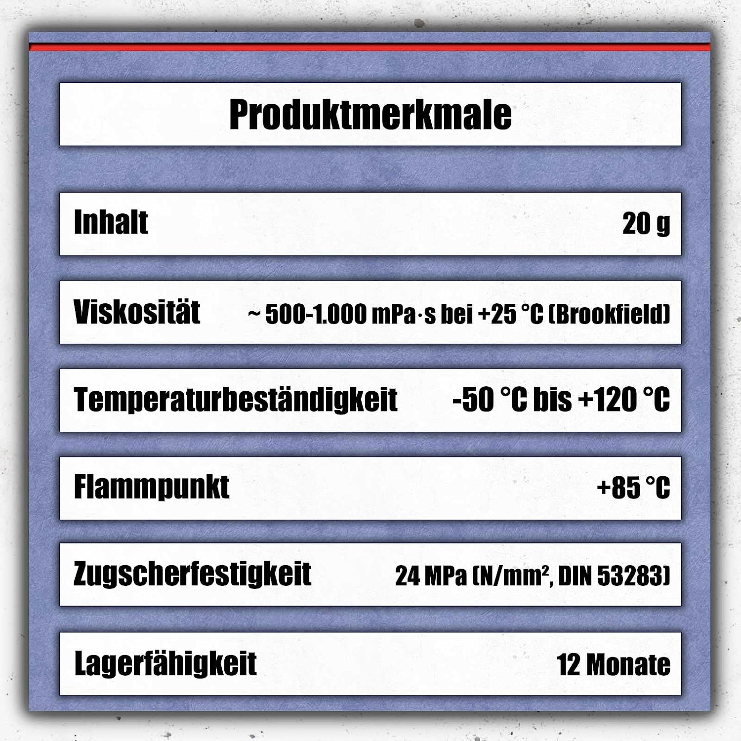 Der schwarze Sekundenkleber hat eine mittlere Viskosität und verklebt nahezu alle Materialien miteinander. Er ist besonders schlagfest und zeichnet sich darüber hinaus durch seine hohe Temperaturbeständigkeit bis +120 °C aus. Der Klebstoff lässt sich punktgenau dosieren und hat eine schnelle Anfangshaftung. Die optimale Aushärtung wird bei Raumtemperatur mit einer relativen Luftfeuchtigkeit von ca. 65 % unter leichtem Kontaktdruck erreicht. Bei Gummi ist die Klebestelle nach etwa 5-20 Sekunden handfest, bei Aluminium nach 20-40 Sekunden. Seine Endfestigkeit erreicht der Klebstoff nach 24 Stunden. Spalten von bis zu 0,1 mm werden gefüllt und überbrückt.