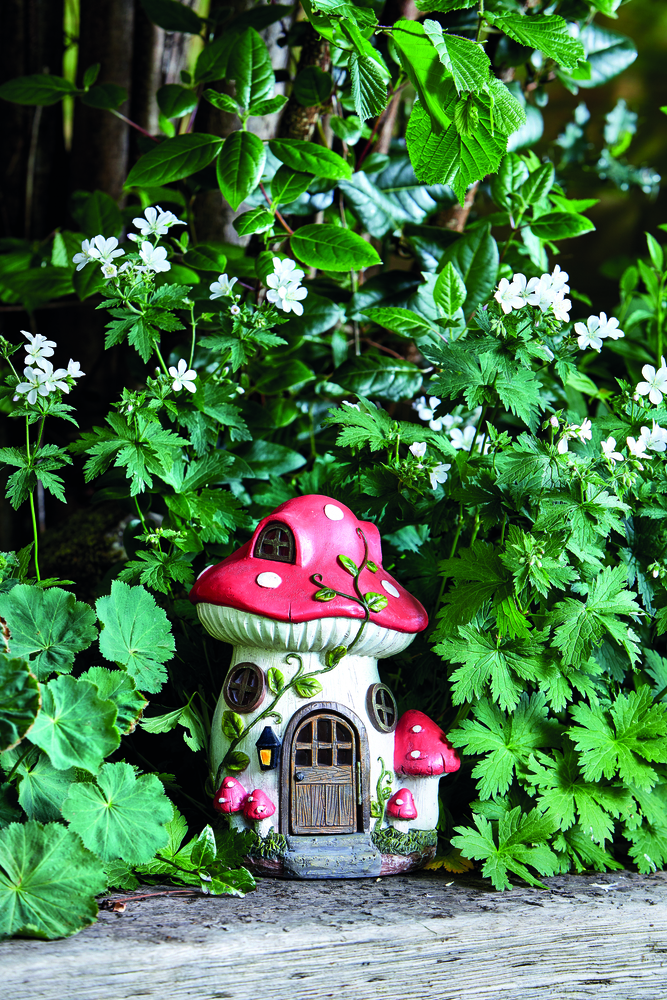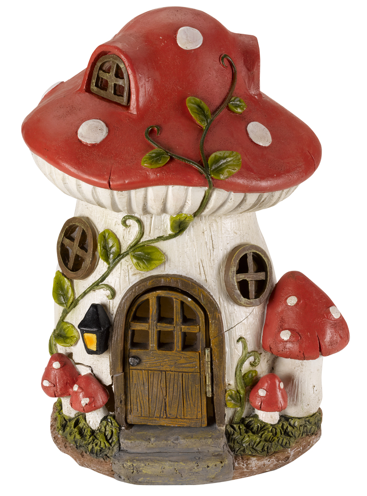 Das Mush-Room Feenhaus in Form eines Fliegenpilzes verzaubert mit seinem handbemalten Design und solarbetriebener Beleuchtung, die sich bei Dunkelheit automatisch einschaltet.