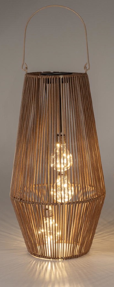 Die stilvolle Laterne in Rattan-Optik (24 × 45 cm) verbindet natürliche Optik mit moderner Solartechnik. Gefertigt aus robustem Metall und bespannt mit naturfarbenen Kunststoff-Bändern, erinnert das Design an klassisches Rattan und sorgt für eine warme, gemütliche Atmosphäre im Garten, auf der Terrasse oder dem Balkon.