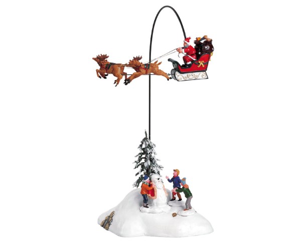 Mit LEMAX 54353 – Santa Claus is Coming To Town bringen Sie ein wahres Highlight in Ihr Weihnachtsdorf. Der Weihnachtsmann saust in seinem Schlitten, gezogen von Rentieren, eindrucksvoll über der Basis und sorgt für eine lebendige, festliche Atmosphäre.