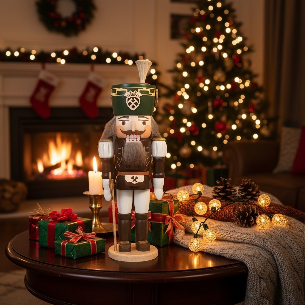 Dieser Bergmann wird in aufwendiger Handarbeit aus heimischen Massivhölzern gefertigt und trägt stolz seine typische Bergmannstracht mit Schachthut. Sein freundlicher Gesichtsausdruck und die feine Verarbeitung machen ihn zu einem besonderen Sammlerstück und einer edlen Weihnachtsdekoration.