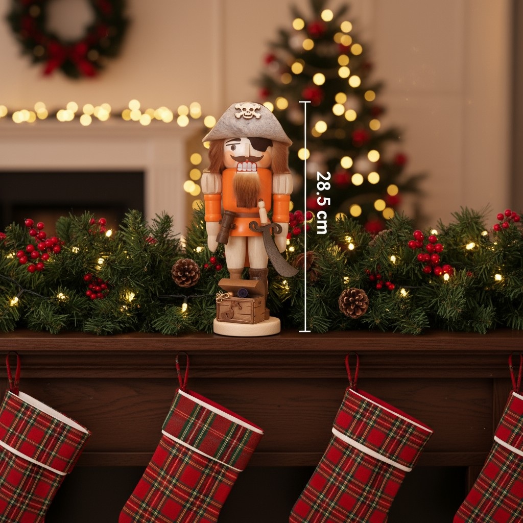 Der Nussknacker Pirat, mittel ist ein echter Hingucker und vereint traditionelle erzgebirgische Handwerkskunst mit abenteuerlichem Charme. Mit Augenklappe, Dreispitz und Säbel ist dieser Pirat bereit, jedes Weihnachtsabenteuer zu bestehen.
