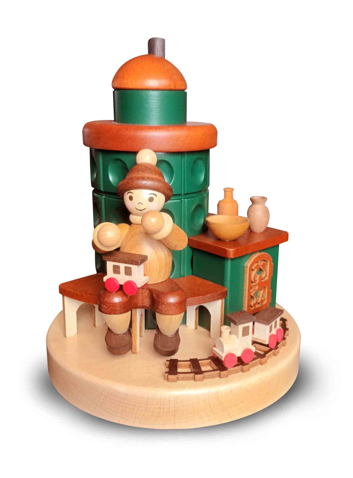 Der Räucher-Kachelofen ist ein liebevoll gestaltetes Meisterstück traditioneller Holzkunst. In grün gehalten und mit einem Jungen und einer Eisenbahn bestückt, verleiht er Ihrer Weihnachtsdekoration Wärme, Gemütlichkeit und nostalgischen Charme.