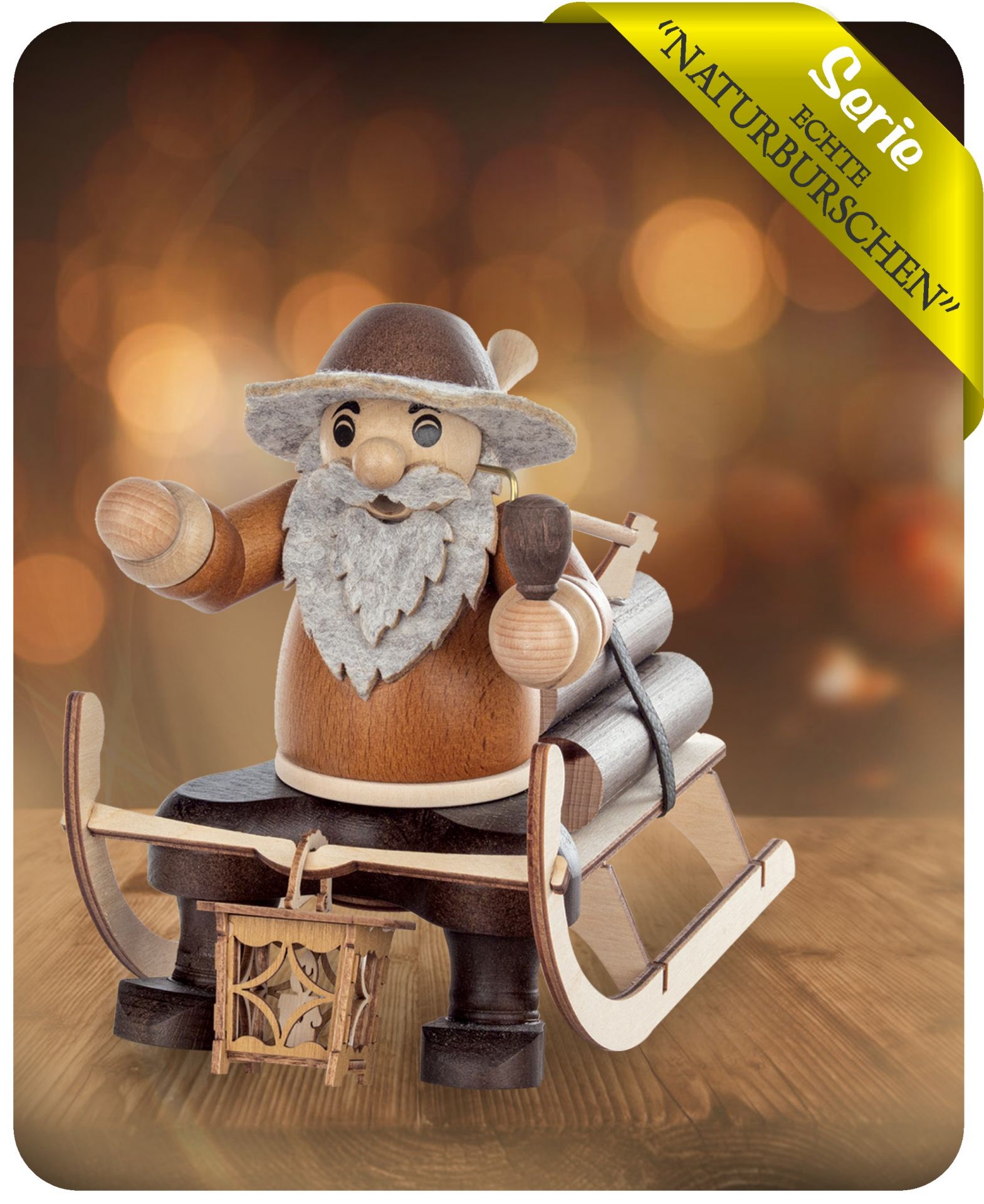 Schwer beladen mit frisch geschlagenem Holz macht sich der Holzfäller auf seinem Hörnerschlitten zurück ins Tal. Gekleidet in Naturtönen mit dunkel abgesetzten Akzenten, Filzhut, weißem Rauschebart und freundlichen Augen verbreitet er sofort gute Laune. Besonders charmant: Am Schlitten baumelt eine Laterne, in der Hand hält er seine Pfeife – ganz wie es sich für einen echten Räuchermann gehört.