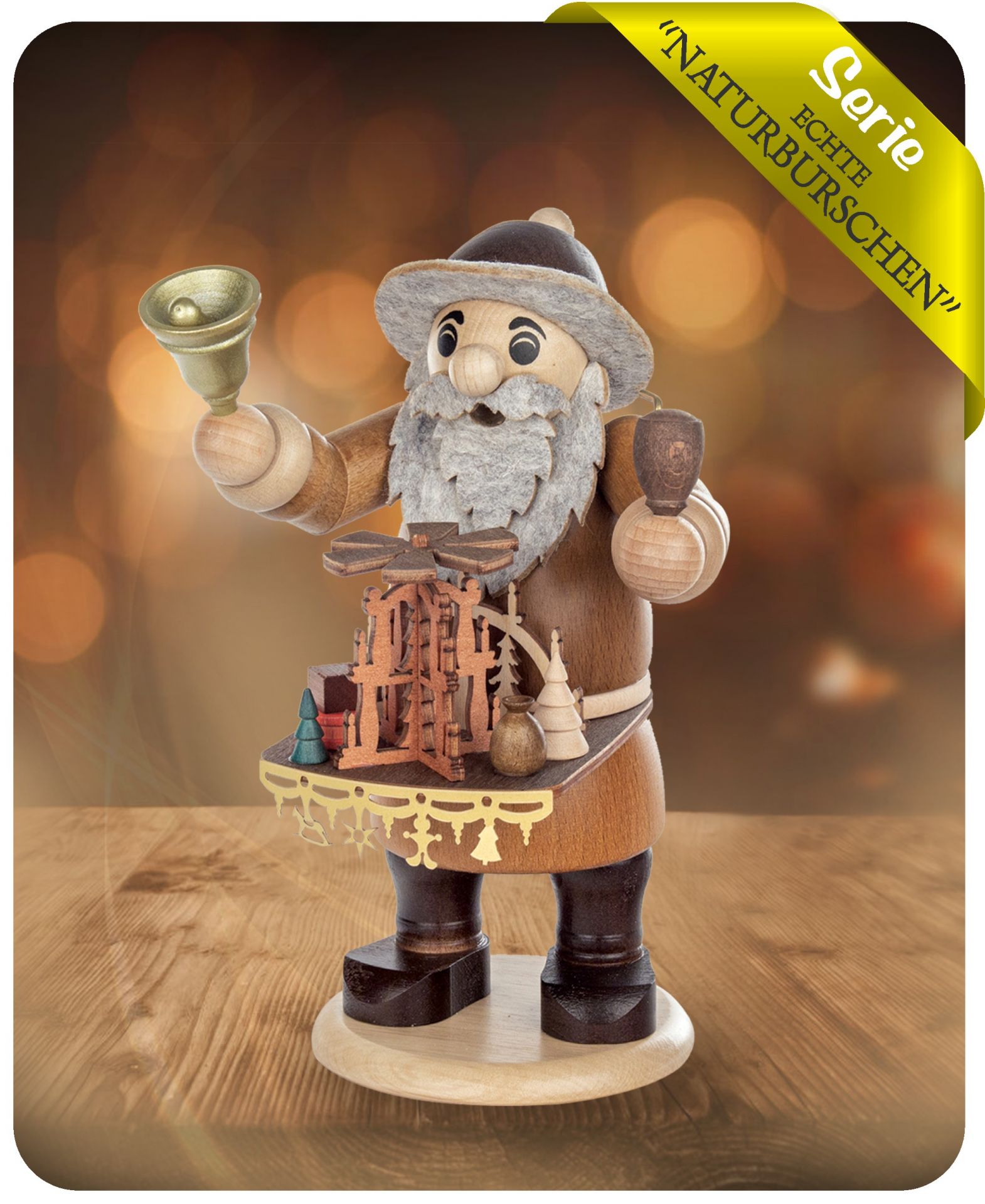 Der Räuchermann Bauchladenhändler aus der beliebten Serie der „echten Naturburschen“ ist ein echtes Stück erzgebirgischer Handwerkskunst. Mit seinem liebevoll bestückten Bauchladen erinnert er an die Tradition reisender Händler vergangener Zeiten.