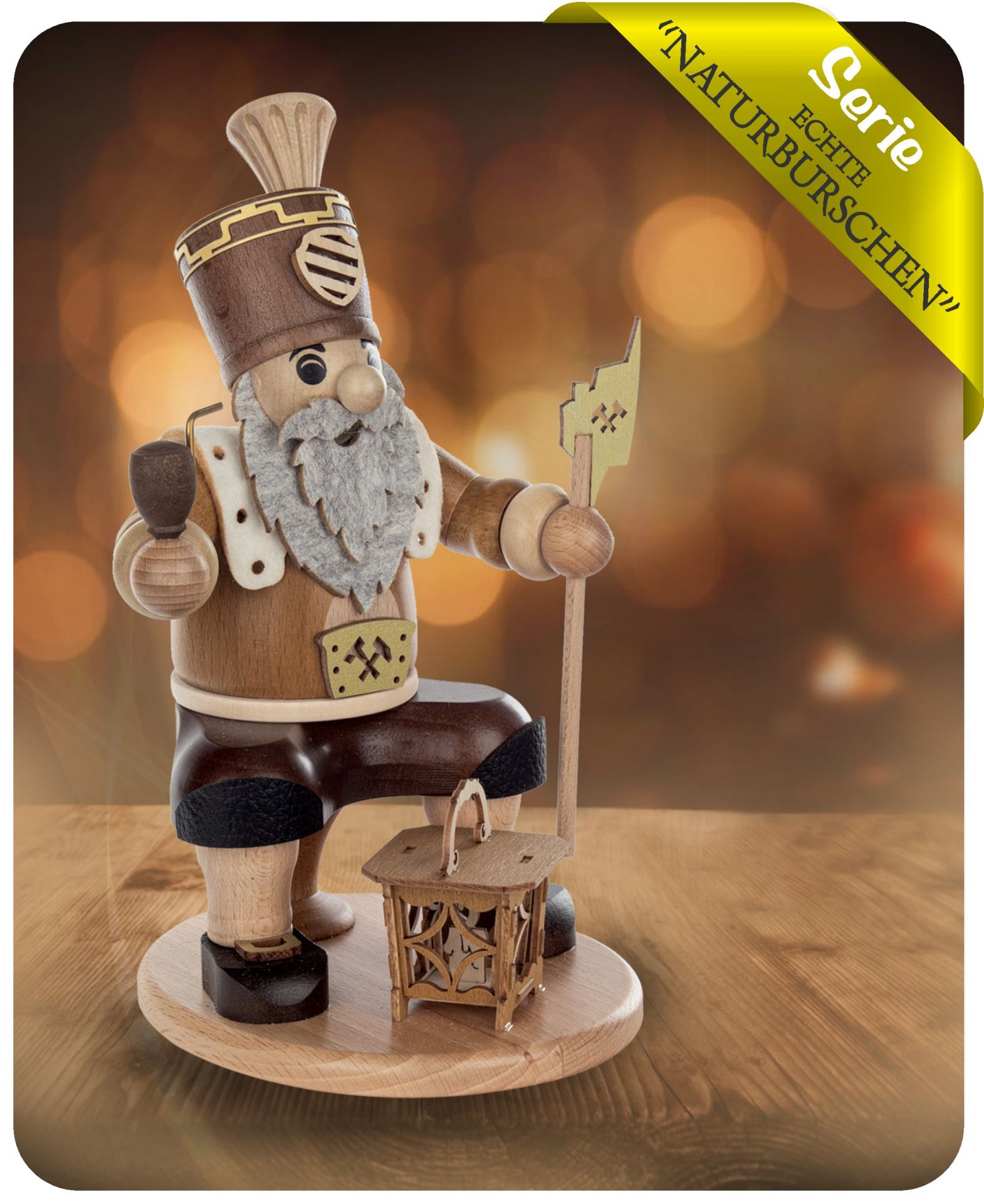 Hergestellt aus heimischen Massivhölzern wie Buche, Hainbuche und Linde überzeugt dieser Bergmann durch hochwertige Verarbeitung und liebevolle Details. Bestückt mit einer handelsüblichen Räucherkerze verbreitet er wohltuenden Duft und sorgt für eine gemütliche Weihnachtsatmosphäre.