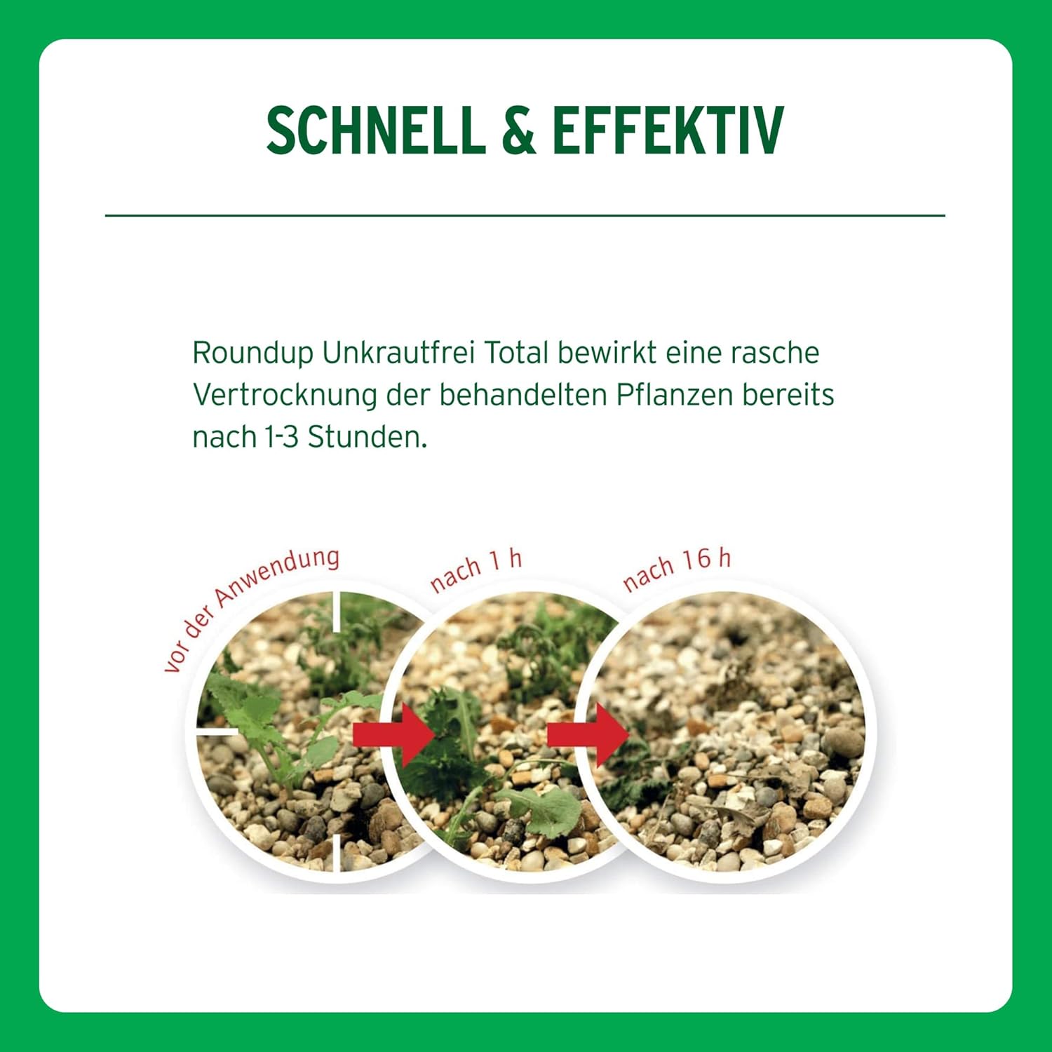 Mit dem Roundup® Unkrautfrei Total Konzentrat entfernen Sie zuverlässig und schnell selbst hartnäckiges Unkraut in Garten, Hof oder auf Wegen. Die leistungsstarke Wirkformel bekämpft unerwünschten Bewuchs bis in die Wurzel – sichtbare Ergebnisse zeigen sich bereits nach 1 bis 3 Stunden.