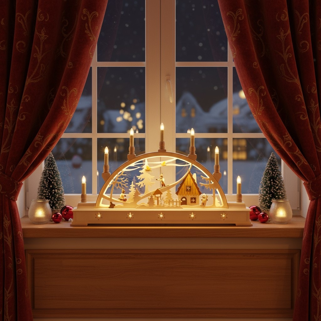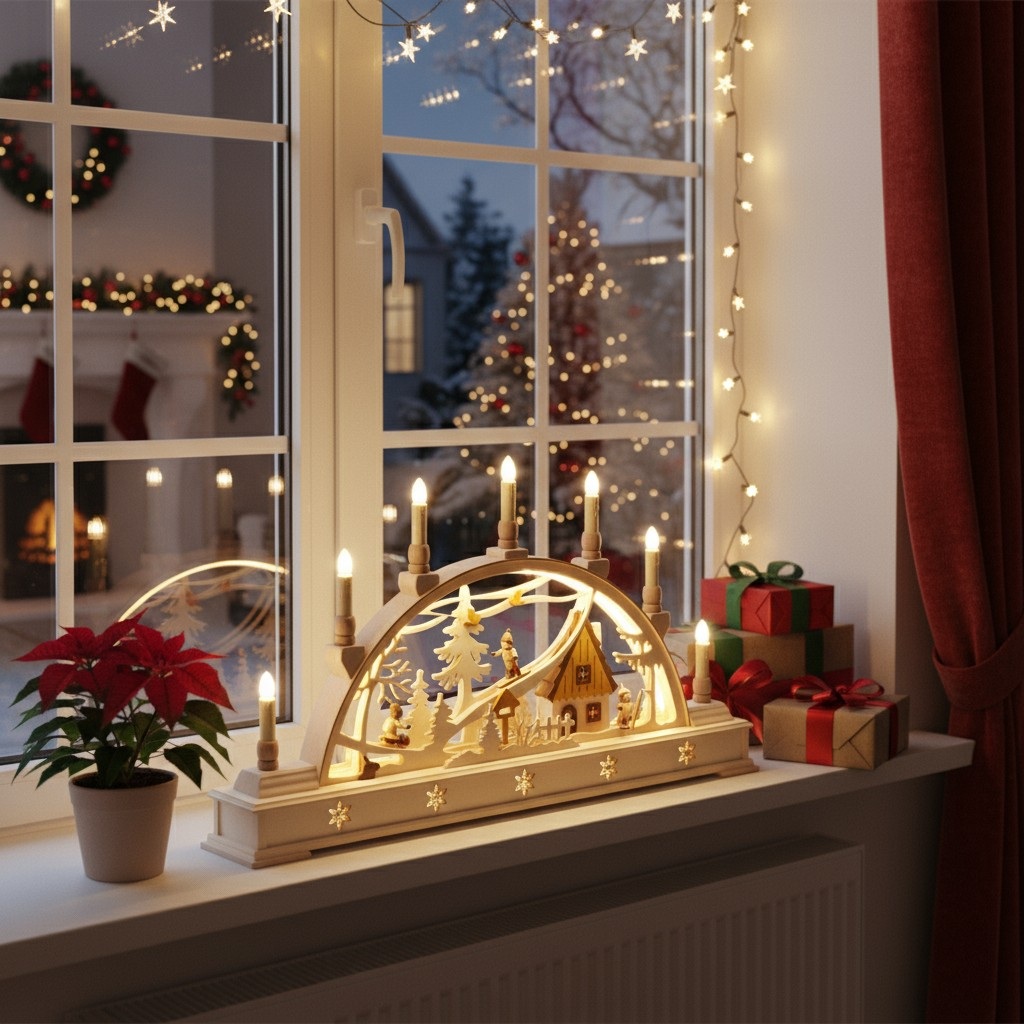 Gefertigt aus hochwertigem Holz und mit großer Sorgfalt verarbeitet, ist dieser Schwibbogen ein echtes Qualitätsprodukt aus dem Erzgebirge – ideal als festlicher Blickfang im Fenster oder auf dem Sideboard.