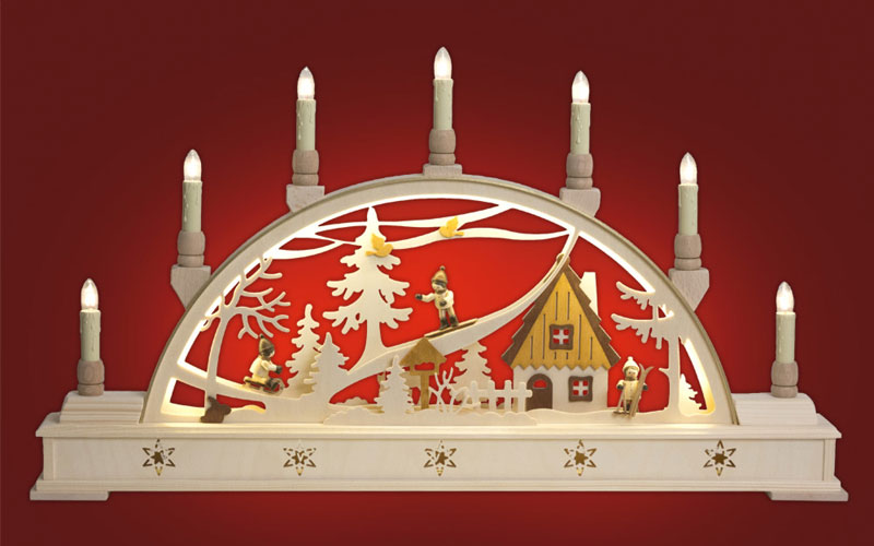 Der Schwibbogen „Wintersportler“ der Firma Holger Seidel aus Schönheide ist ein wunderschönes Stück erzgebirgischer Handwerkskunst, das winterliche Stimmung und sportliche Lebensfreude perfekt vereint.
