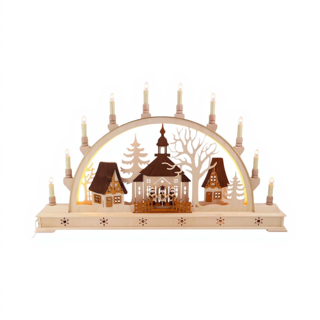 Der Schwibbogen „Kirche mit Sternsängern“ von der renommierten Firma Seidel aus dem Erzgebirge ist ein prachtvolles Beispiel echter erzgebirgischer Handwerkskunst.