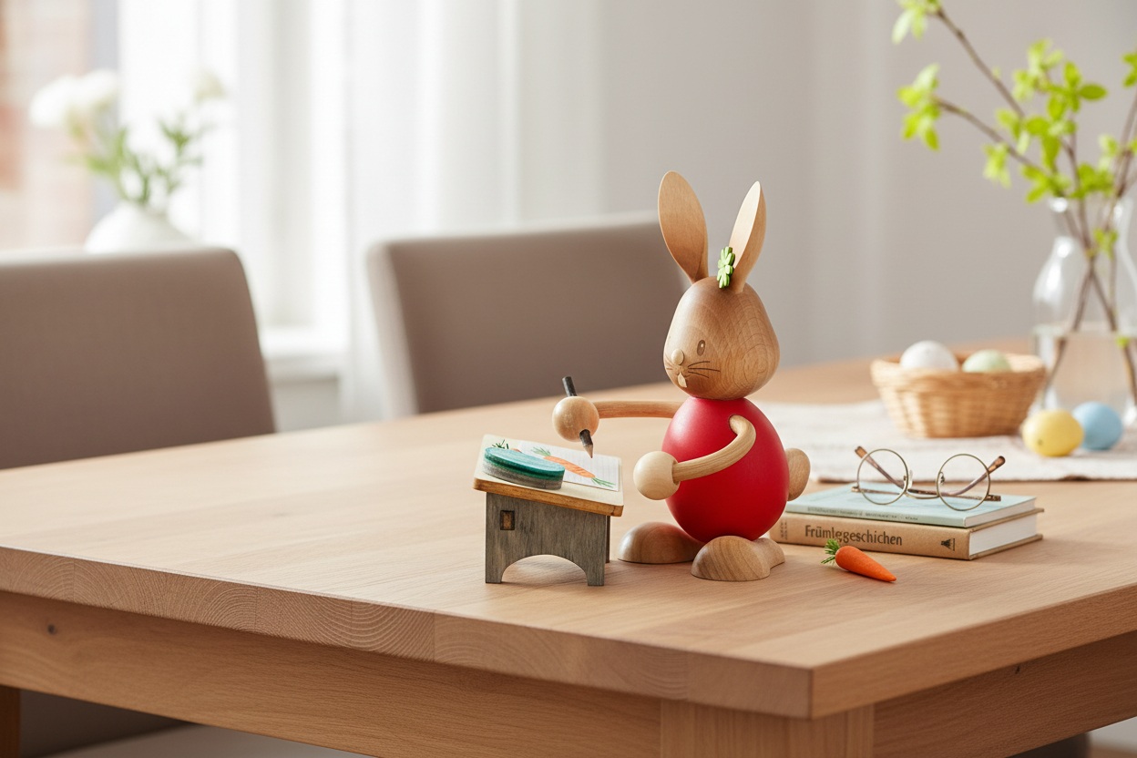 Die fröhlichen Stupsi Hasen der Drechslerei Kuhnert sind schon ab den ersten Sonnenstrahlen voller Tatendrang unterwegs. Der Stupsi Hase Schüler steht konzentriert an seinem Schultisch und löst eine Aufgabe – voller Eifer und Lernfreude. Eine charmante Figur, die Osterstimmung mit einem Hauch von Schulalltag verbindet.