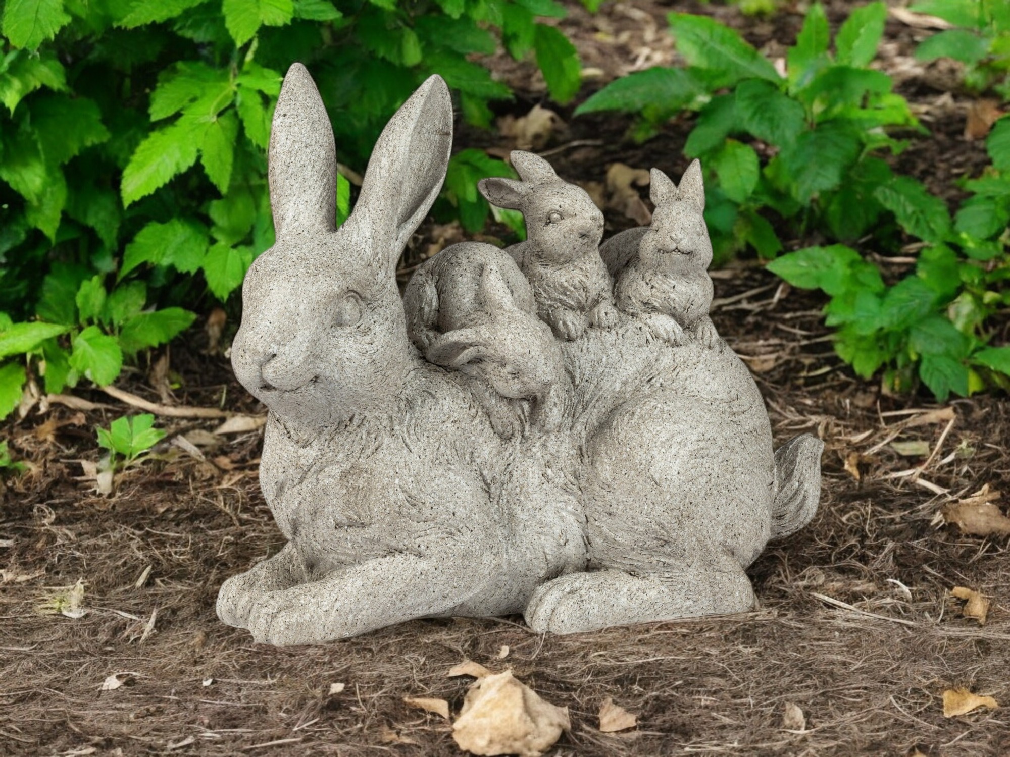 Einzigartiges Design: Die 34 cm große Hasengruppe bezaubert mit einer charmanten Mutterhäsin und ihren drei kleinen Hasen.